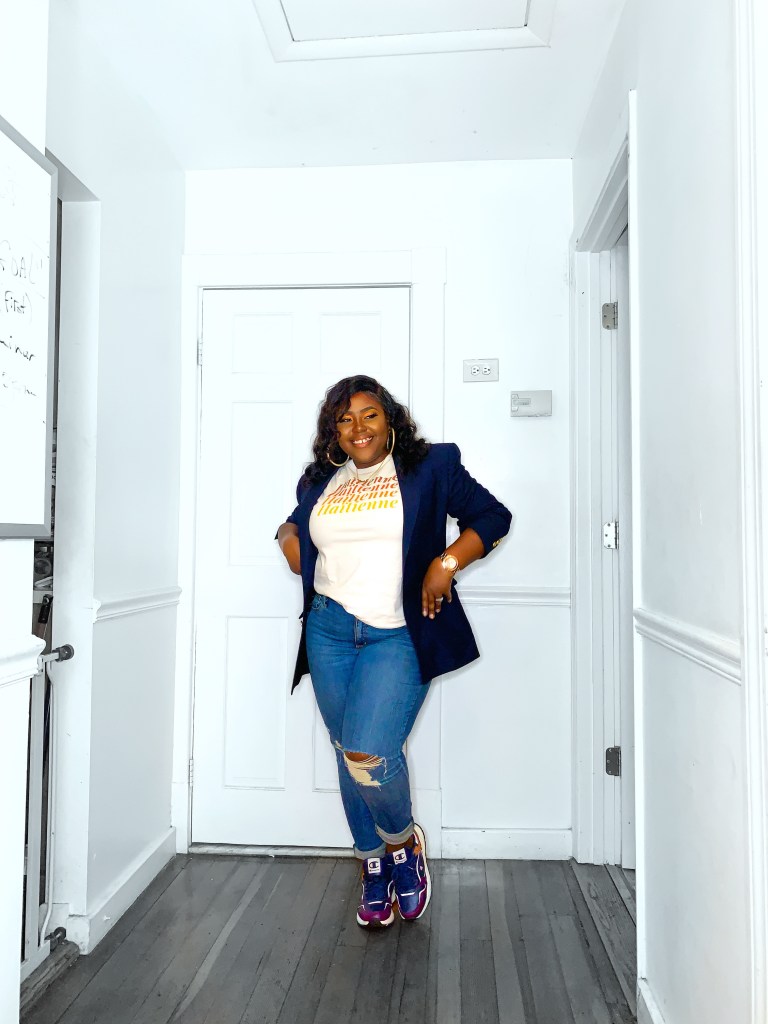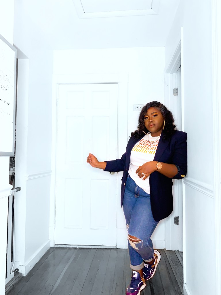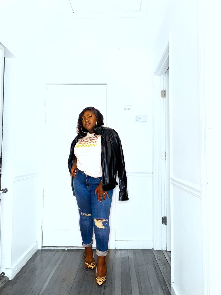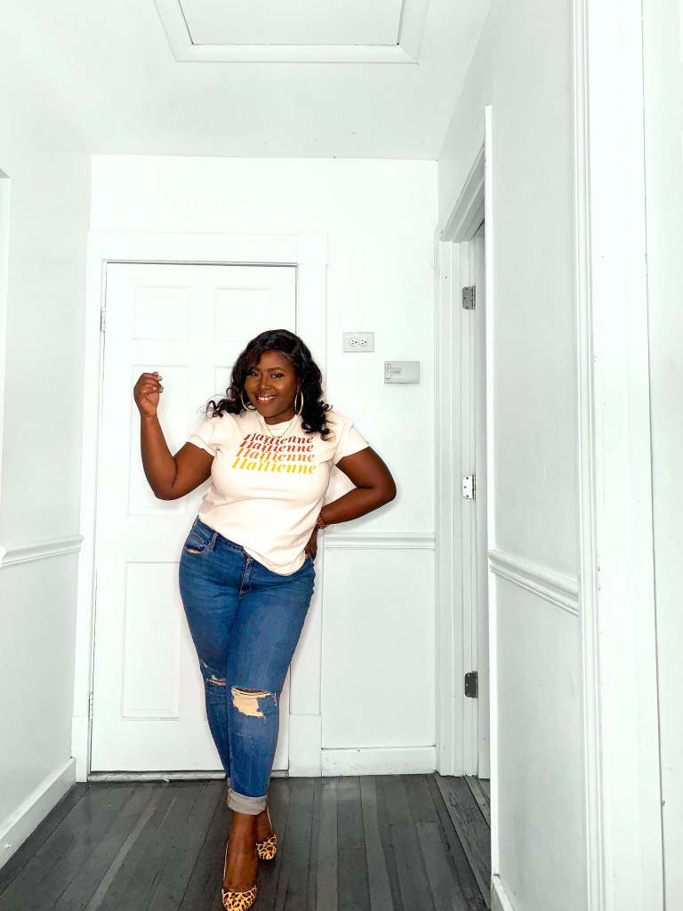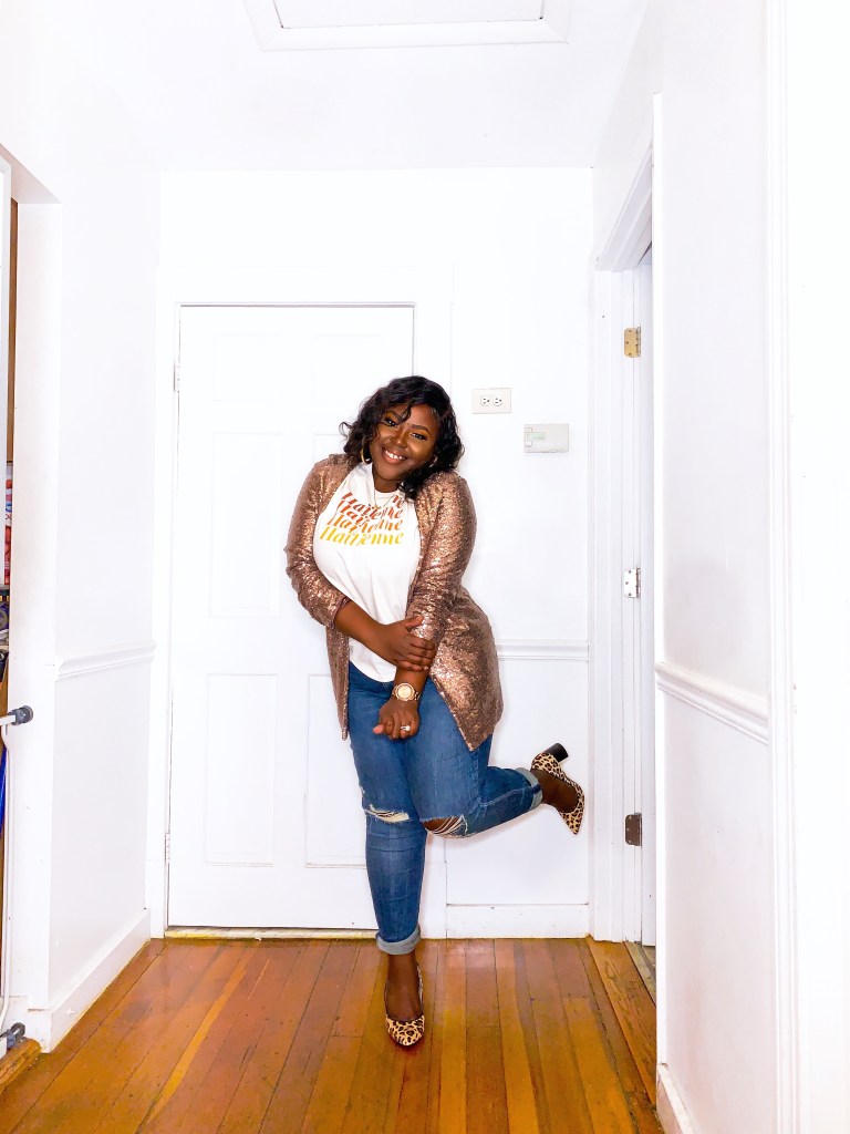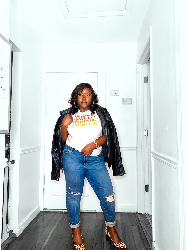 The shirt that I am wearing is by KomsiLike; a brand new Haitian apparel and accessories website. Komsi Like can be easily be part of one of those Haitian-Creole/English word that doesn’t have a proper translation. It’s a cool slang that any Haitian girl has used to make a point or state a point. The first item that I knew could be a repeat offender in my wardrobe is this beautiful “The Haitienne” (Translated to Haitian Girl in Haitian-Creole) tshirt. I wore with it with sneakers, a flashy gold sequin blazer and a real boyfriend leather jacket.